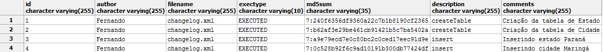 Os campos id e autor correspondem aos valores informados nos respectivos atributos encontrados no changeset. O campo filename é utilizando para armazenar o nome do arquivo do qual o changeset está incluso. Com base na informação contida nos campos id, autor e filename, o Liquibase irá gerar um hash e o campo md5sum é onde esta informação fica armazenada.