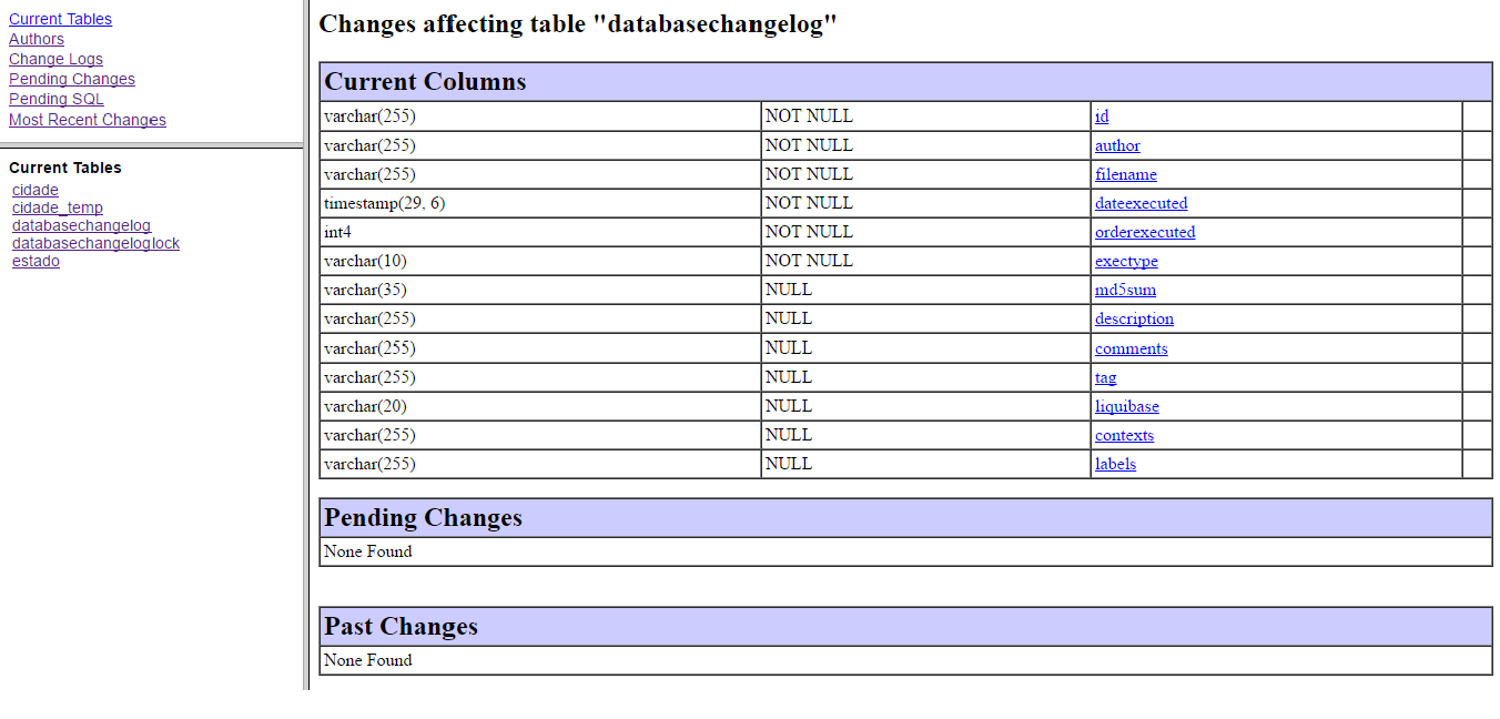 Como resultado, o Liquibase deverá gerar um relatório conforme apresentado no Exemplo 32.